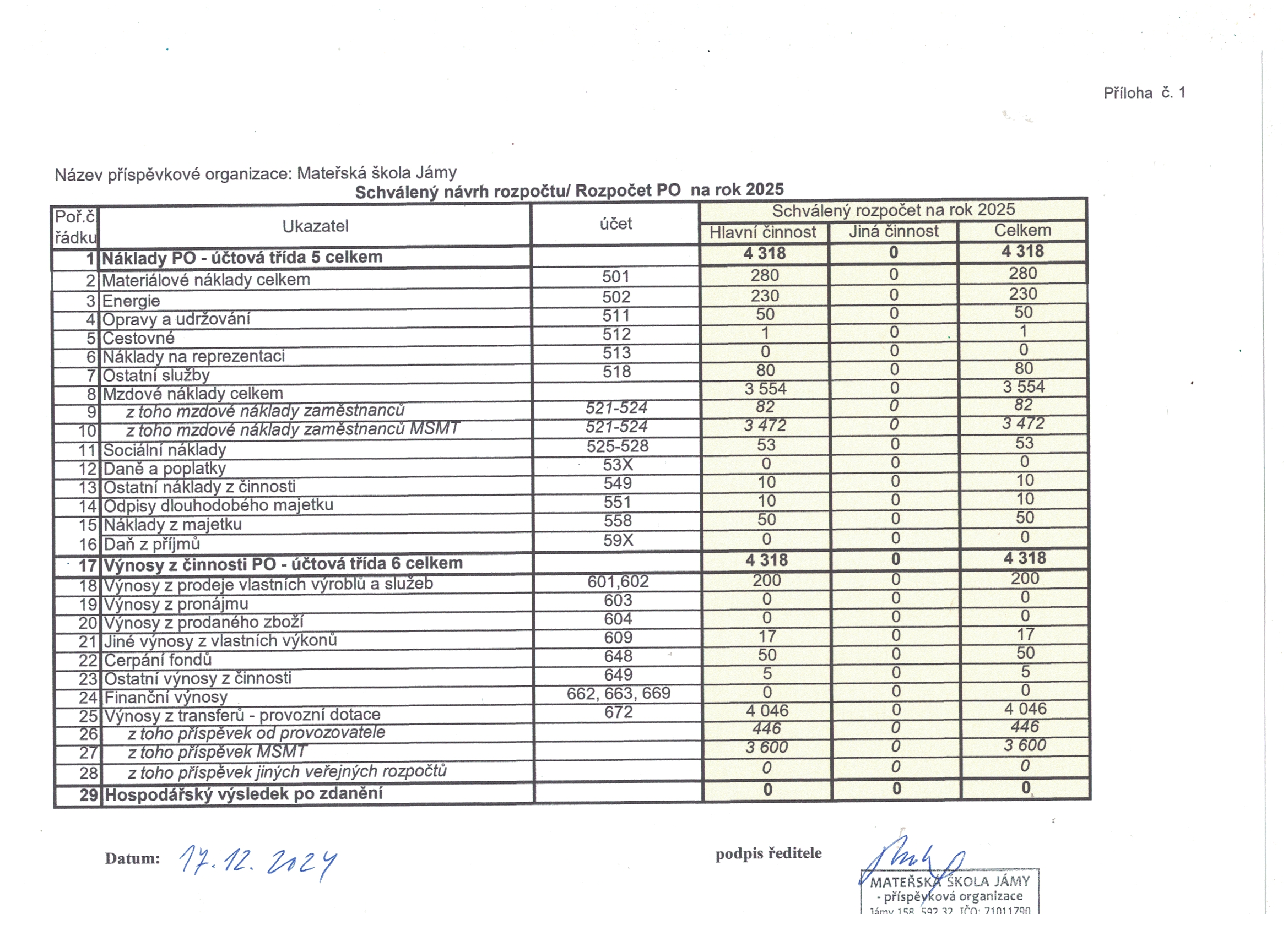 Schválený rozpočet PO na rok 2026