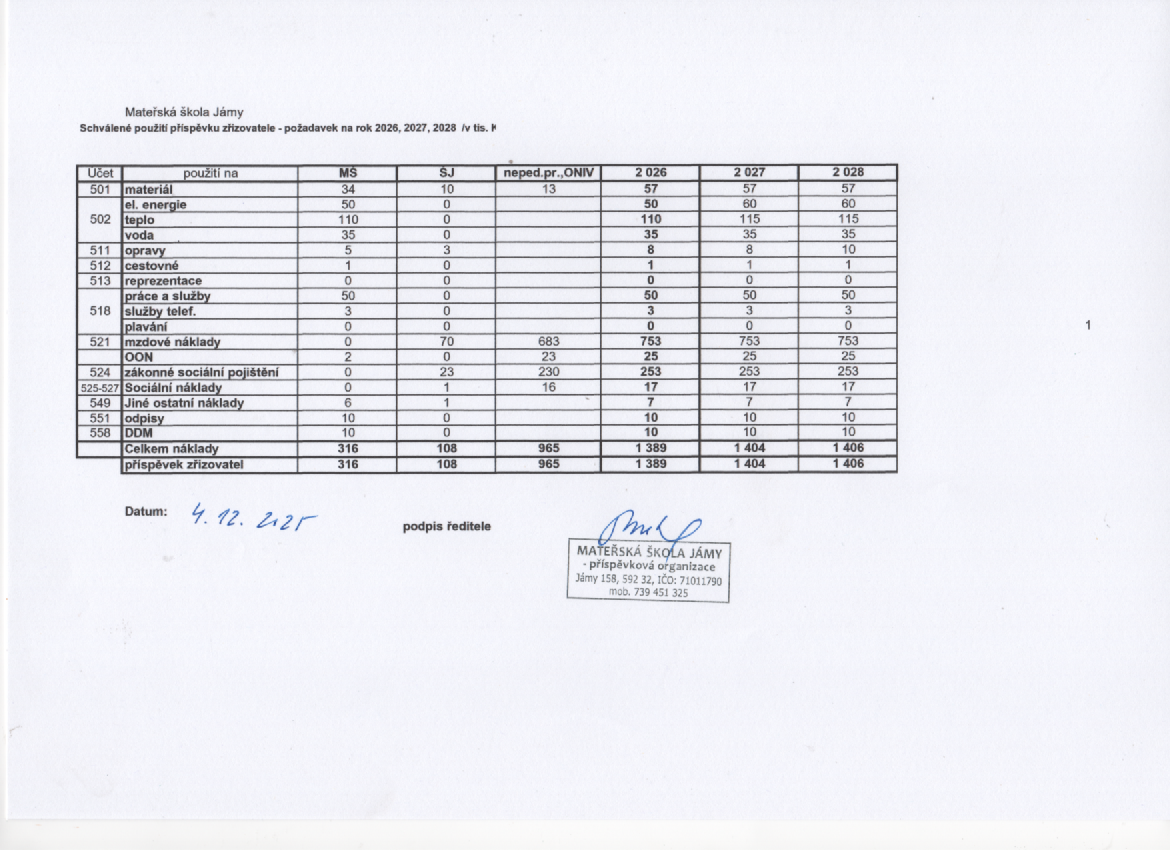 Schválené použití přspěvku zřizovatele 2026-2028