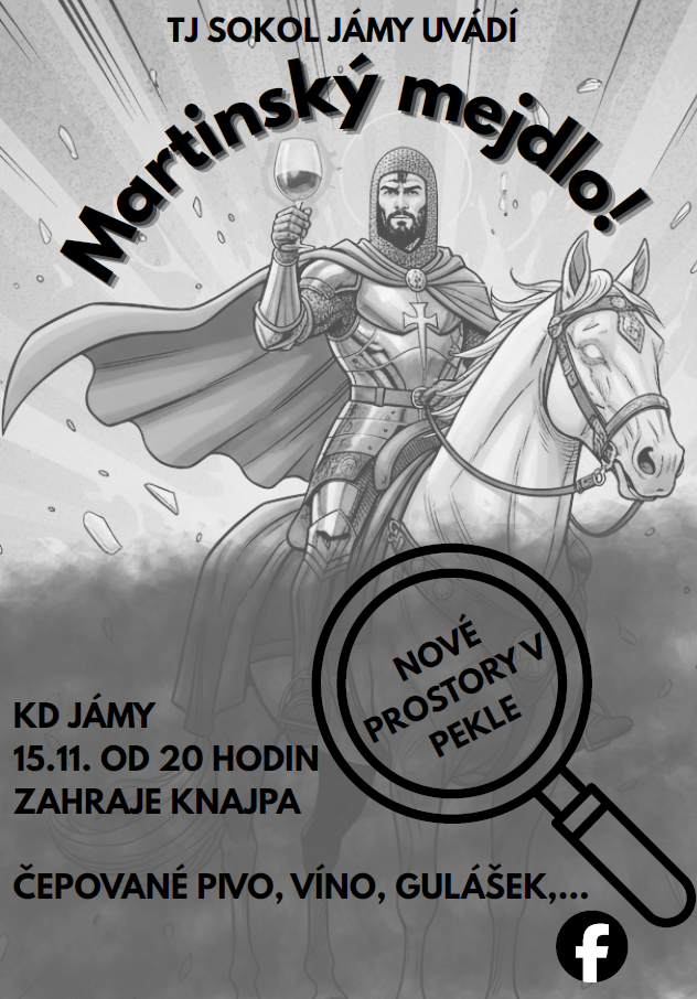 TJ Sokol Jámy zve všechny občany a jejich známé na sobotu 15. 11.2025od 20 hod. do kulturního domuv Jámách na Martinslé mejdlo.